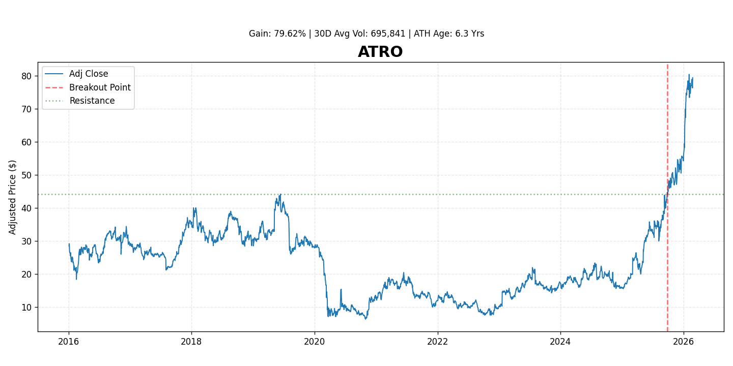 Current Status: ATRO has demonstrated strong momentum, gaining 79.6% since its recent breakout.
